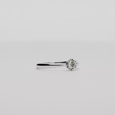 Solitaire ring in 18K white gold with a round brilliant-cut diamond weighing 0.20 Carat, color L and clarity I. The ring weighs 2.73 grams and measures 2.39 millimeters in width and 1.54 millimeters in height.