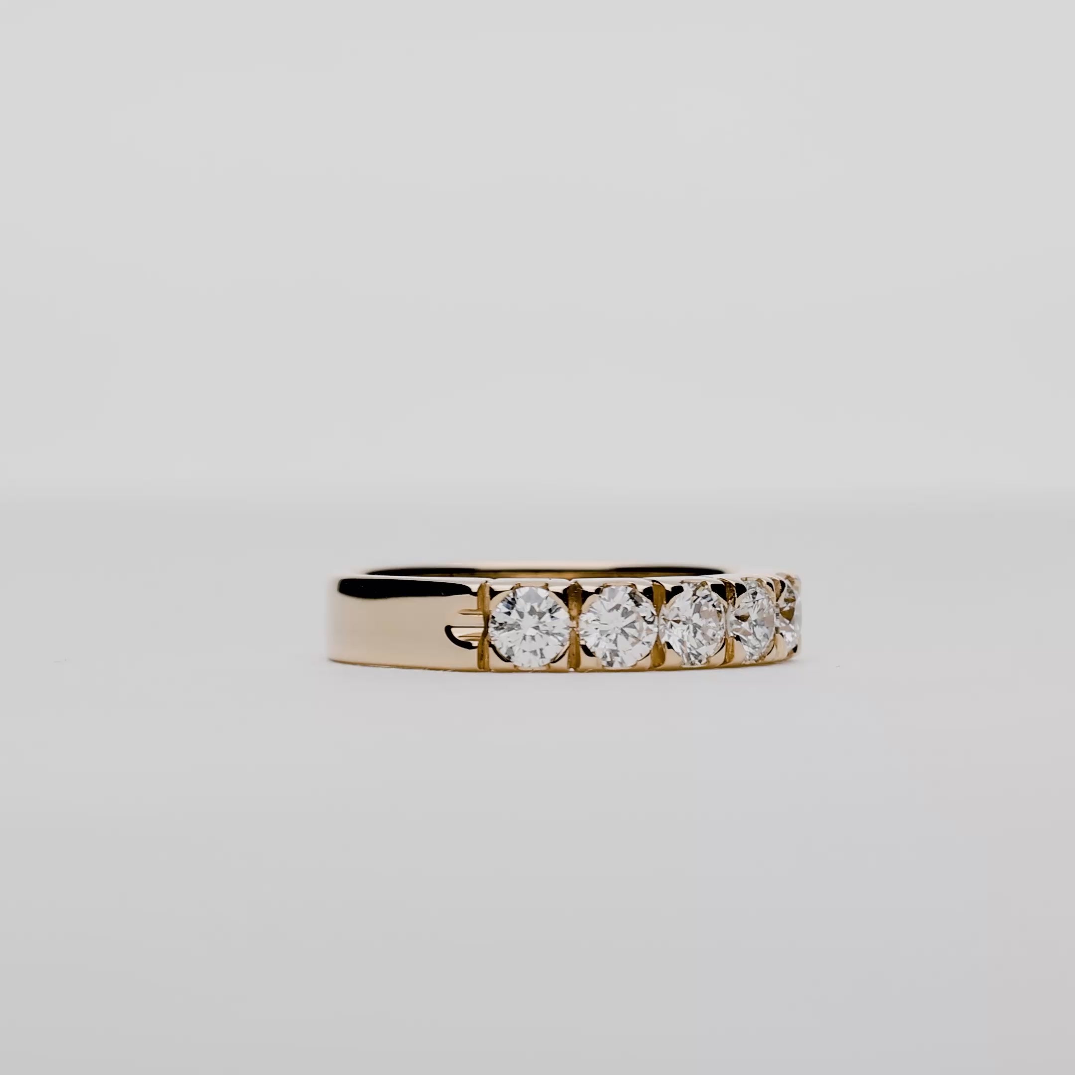 Alliansering i 18K gull med en totalvekt på 5,91 gram. Ringen er prydet med fem briljantslipte diamanter med en total Carat på 1,00 i fargen H og klarheten I. Skinnen har en bredde på 4,25 millimeter og høyde 2,89 millimeter.