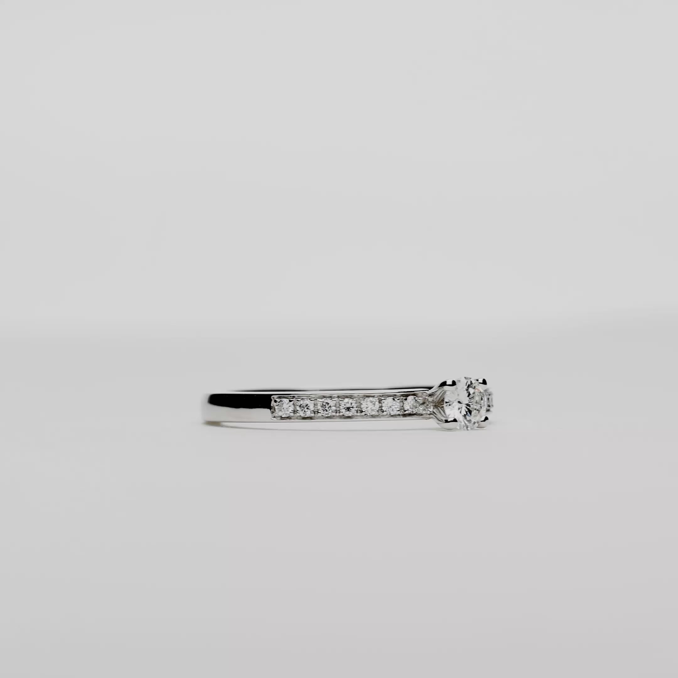 Sidesteinsring i 18K hvitt gull med en briljantslipt diamant på 0,20 Carat samt 14 briljantslipte diamanter med en total Caratvekt på 0,15. Ringen veier 3,88 gram og måler 2,22 millimeter i bredde og 1,92 millimeter i høyde. Alle diamantene har farge G og klarhet VS.