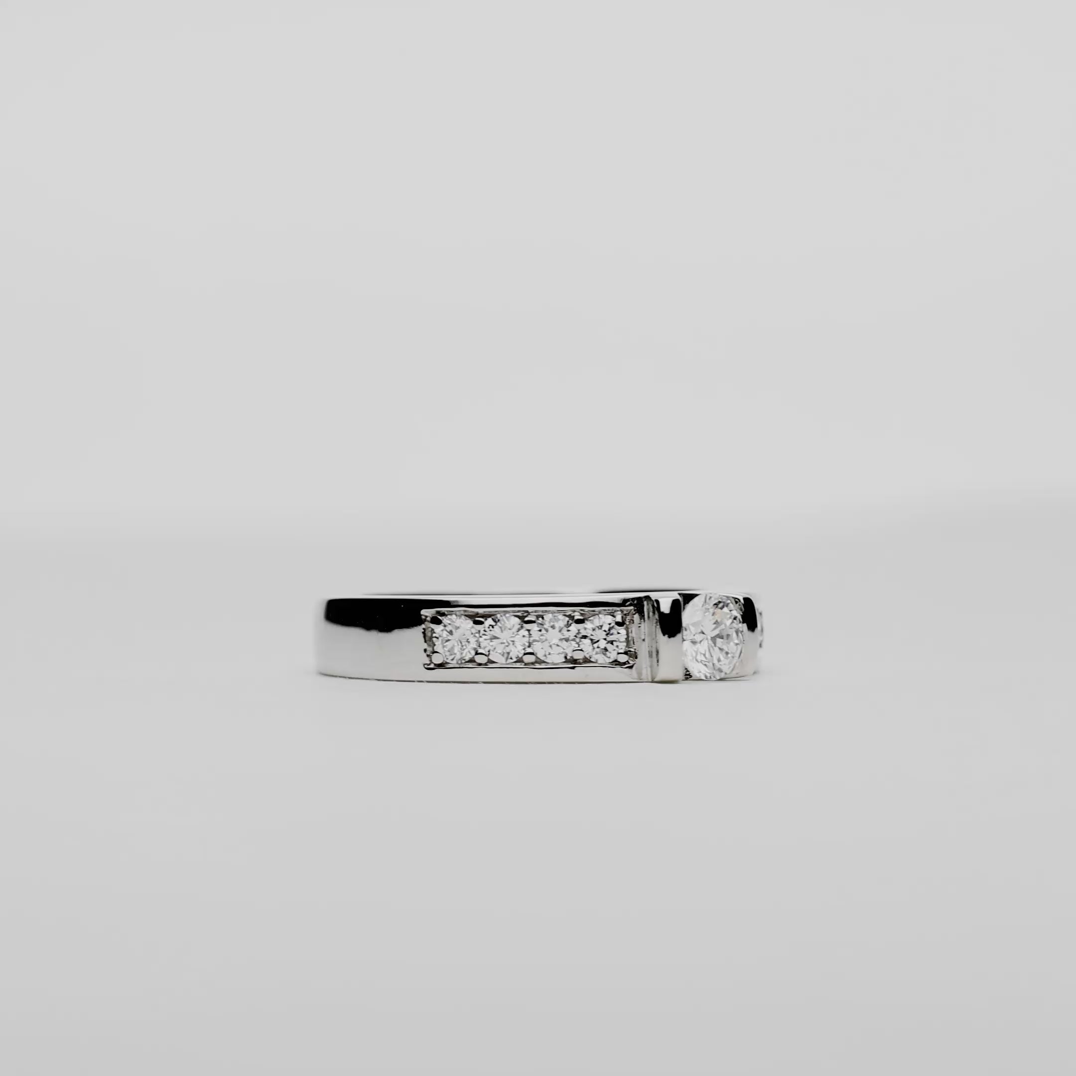 Sidestenring i 18K hvitt gull med en briljantslipt diamant på 0,23 Carat og åtte briljantslipte diamanter med en total Caratvekt på 0,32, alle i kvaliteten H SI. Ringen veier 5,97 gram og måler 3,90 millimeter i bredde samt 2,30 millimeter i høyde.