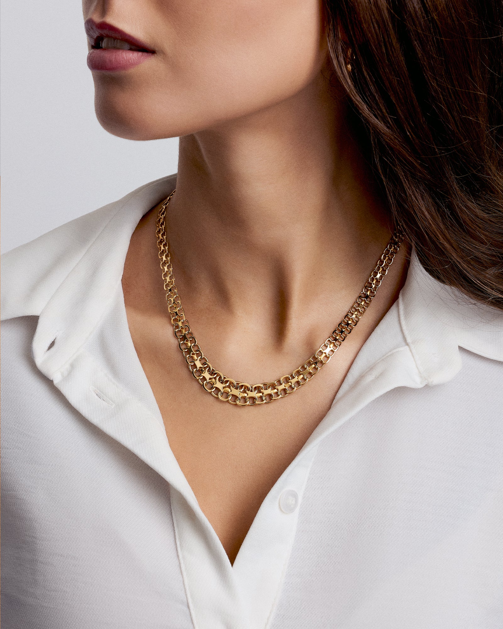 X-länkhalsband av guld i bredare designer är ett halsband som tydligt symboliserar exklusivitet och lyx. Den bredare X-länken ger halsbandet en väldigt tydlig närvaro. Det är ett halsband som gör intryck på egen hand och bärs med självklarhet och som därför passar mycket väl till festligare, mer uppklädda tillfällen men som likaväl kan bäras i det vardagliga livet. Samtliga X-länkhalsband i våra kollektioner är tillverkade i solitt äkta guld och i fullkomligt nyskick - alltid med äkthetscertifikat.