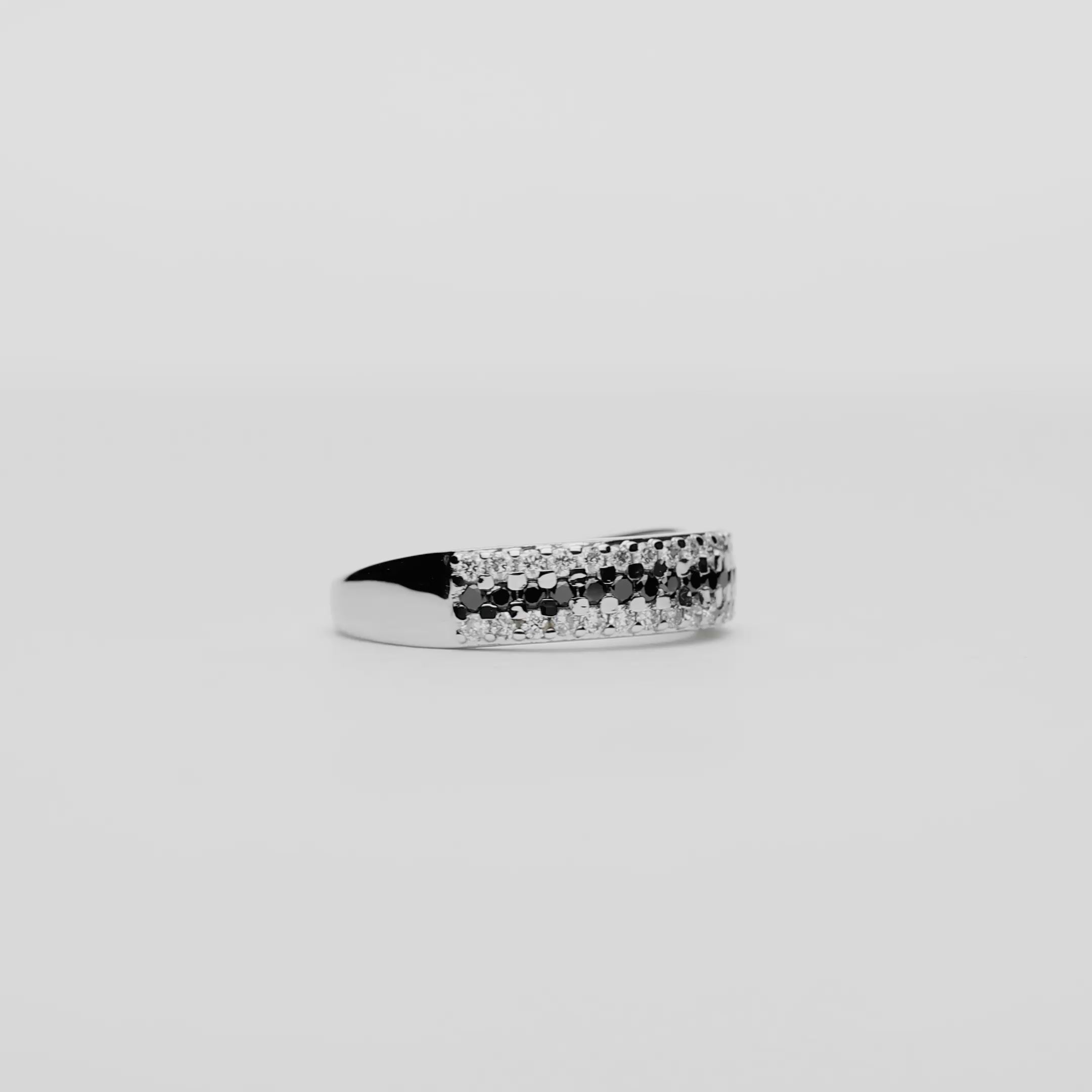 Alliansring i 18K vitguld med en vikt på 2,78 gram. Ringen är prydd med 51 naturliga briljantslipade diamanter, som tillsammans väger 0,52 carat. Diamanterna består av 17 stycken svarta diamanter som väger 0,17 carat och 34 stycken vita diamanter som väger 0,34 carat och är i kvalitén H I.